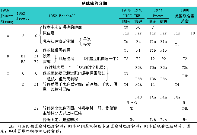 目前使用的膀胱肿瘤TNM分期标准是1974年UICC年会上提出的,l按照累及膀胱壁的深度分别定为Pis、iP1、iP2、iP3和P4,lP或T字表明组织病理或临床资料。
