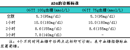 第一,l依据第三届国际GDM会议即美国国家糖尿病资料组(NDDG)推荐的3小时l00gOGTT诊断标准。静脉血浆空腹血糖为5.8mmol/L,l1小时血糖为l0.61mmol/L,l2小时血糖为9.21mmol/L,l3小时血糖为8.11mmol/L,l如有两个或两个以上值大于或等于以上标准则诊断为妊娠期糖尿病(GDM);有一个值大于或等于以上标准则诊断为妊娠期糖耐量减低(gestational1impaired1glucose1toler-ance,lGIGT)。第二,lWHO标准。建议行2小时75gOGTT,l只要2小时血糖≥7.81mmol/L即可诊断。第三,lC&C-GDM标准。在美国普遍采用的是由Carpenter与Coustan(1982年)修改的O’sulli-van与Mahan标准,l该标准是基于孕妇群体检测,l同时考虑到GDM母亲及其胎儿的风险因素而制定的。ADA从2000年开始采纳Carpenter与Cous-tan(C&C-GDM)血浆葡萄糖阈值诊断C&C-GDM阈值低于以前所推荐的国家糖尿病数据组(NDDG)阈值。有研究显示由NDDG阈值除外GDM但符合C&C-GDM血浆葡萄糖阈值GDM诊断的孕妇,l围产期并发症(巨大儿、i新生儿低血糖、i高胆红素血症)风险显著增加,l因此C&C-GDM血浆葡萄糖阈值能更好地预测并发症风险,l从而支持ADA采纳C&C-GDM阈值用于GDM诊断。