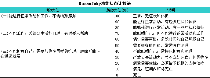 功能状态是对机体总的机能状态的一般估计,l表示患者的生存质量。1948年,lKarnofsky首先提出肿瘤患者的功能状态的计数方法。此法主要根据患者所能进行的活动程度和是否需要医疗照顾而进行计分。100%表示完全正常,l大于70%表示功能状态良好,l50%~70%功能中等,l小于40%功能差,l0表示死亡(见下表)。此法已为许多学者接受,l对肿瘤患者的预防和预后估计也有帮助。