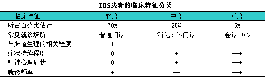肠易激综合征(irritable1bowel1syndrome,lIBS)是一种常见的慢性功能性肠道疾病,l其特征是大便习惯和性状的改变、i腹痛、i腹胀而无器质性病理改变。在肠易激综合征的流行程度上女性与男性相比有明显的不同。在美国家庭调查中,l肠易激综合征存在于14.5%的女性,l而在男性仅为7.7%。相似的流行病学上的差别在其他西方国家的研究中也有报道。在我国,lIBS患者占消化专科门诊的比例竞高达20%~50%。目前,lIBS的各种诊断方法是以症状为基础的,l并不评估疾病的严重性,l故不能对IBS的治疗策略提供充分的帮助。为此Drossman等根据疾病的临床特征将IBS患者分为轻、i中、i重三类(见下表)。