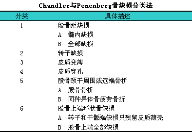Chandler与Penenberg分类(见下表)是最早的分类,l1989年由Chandler和Penenberg提出。分为六种类型:i股骨距缺损、i大转子缺损、i皮质变薄、i皮质穿孔、i股骨骨折和股骨环状缺损。