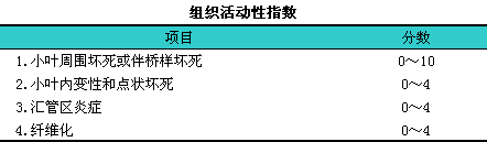 慢性肝炎活动性的分级:i是衡量坏死和炎症程度的方法,lCPH、iCAH和CLH仅反映了分级。目前应用最广泛的是组织学活动性指数(HAl),l又称Knodell积分,l包括4种项目(见下表)。前3项表示分级,l第4项是分期。许多病理学家已将前3项与第4项分开考虑。HAl或其他半定量积分系统系对坏死、i炎症活动性的归纳,l但不能代替对肝组织病变的具体描述。这些分级法都有优点和缺点,l需要不断完善(见下表)。