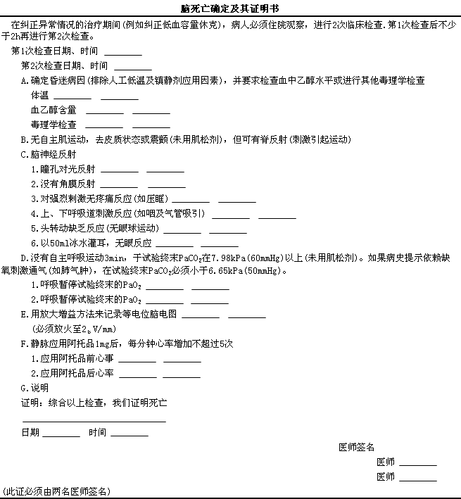 美国匹兹堡大学长老会医院使用的确定脑死亡标准及其证明书见下表。