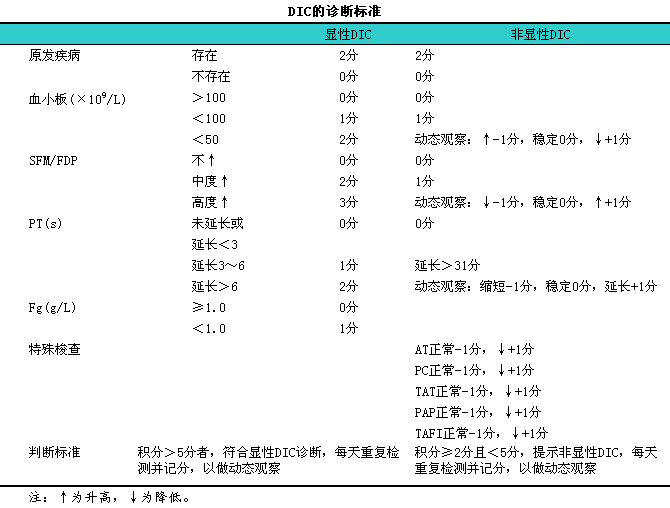 DIC专业委员会主张采取记分法诊断DIC。见下表。