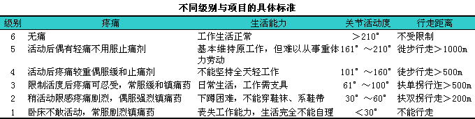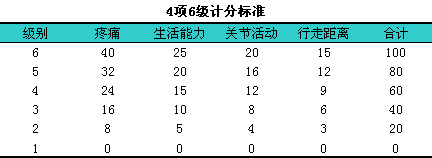 本标准为100分制,l临床检查结果为四项,l即疼痛、i生活能力、i关节活动度、i行走距离。每项分为6级,l1级最差,l6级最好(见下表)。