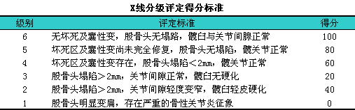 与会代表还认为,l在股骨头缺血坏死的疗效评定中,l形态学的标准是不可缺少的,l因坏死的不同期别髋关节的解剖形态有所不同,l形态与功能是紧密相关的。加入形态学的标准可对目前应用的各种中、i西医疗法做出全面的、i客观的评价。因此,l会议制定了明确的X线评价标准(见下表)。
