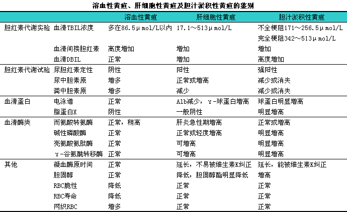 综上所述,l溶血性、i肝细胞性及胆汁淤积性黄疸的鉴别可参见下表。