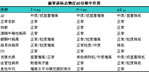 2)其他痴呆性疾病中也会出现脑脊液T-tau蛋白增高,l如额颞叶痴呆和Lewy体痴呆。而酒精中毒性痴呆,l慢性神经系统疾病(如Parkinson病)和精神疾病(如抑郁症)只会偶然出现脑脊液T-Tau蛋白升高。急性脑卒中后tau蛋白水平会有过性升高,ltau蛋白和梗死灶存在正相关。DJD患者脑脊液tau显著增高。下表显示了其他急性和慢性神经疾患脑脊液中tau含量的变化。
