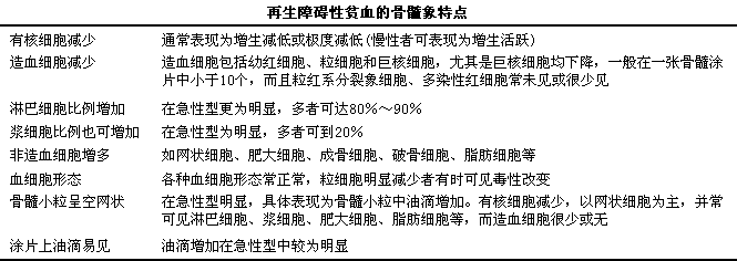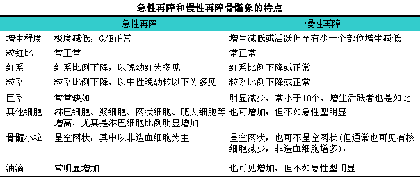 由于患者骨髓中的造血组织减少并被脂肪组织替代,l所以抽取骨髓液时通常比较稀薄、i骨髓涂片油滴常明显增加,l这是再障患者的特点之一。所以,l如果血常规检查表现为三系减少而骨髓涂片上油滴多的患者,l临床医生要首先考虑到再障的可能性。但是油滴增加不是再障所特有的,l它也可见于老年人、i造血功能低下、i多次化疗后等患者。急性和慢性再障的骨髓象特点见下表,l空网状骨髓小粒虽然是再障的主要特点之一,l但并不见于所有再障患者;而空网状骨髓小粒也不一定就是再障,l如见于造血功能低下、i老年人、i白血病多次化疗之后等。骨髓检查诊断再障中起着非常重要的作用,l典型的患者通过骨髓检蠢可明确诊断(但不能区分急性和慢性再障),l对于不典型患者可协助诊断。如果怀疑再障但骨髓象不典型患者或取材不佳的情况下,l应更换骨髓穿刺位点进行复查。