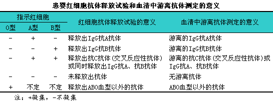 用术瓜蛋白酶处理O型、iA型、iB型红细胞,l再与患婴的血清孵育致敏,l若已经凝集,l说明存在相应的抗体;若不凝集,l则将红细胞洗涤后,l再作直接抗人球蛋白试验,l观察结果。患婴血清中游离抗体测定的意义见表10-25。