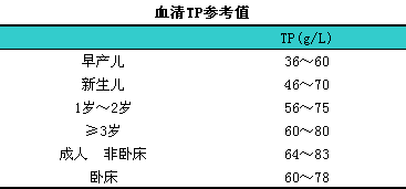 血清TP与年龄和体位有关.成人比婴儿和儿童高,l非卧床者比长时间卧床的患者高。见下表。