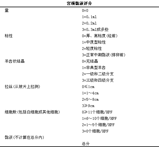 2)Moghissis评分法:i宫颈黏液评分标准见下表,l以15分为排卵前高雌激素满分。
