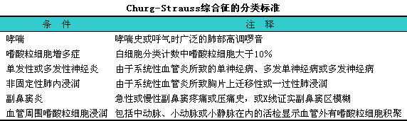 1990年美国风湿病协会提出六条分类诊断标准,l见下表。凡符合其中4条或以上者可考虑为变应性肉芽肿血管炎(Churg-Strauss综合征)。