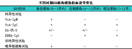MA-IgG与病毒的中和反应有关。不同时期EB病毒感染的血清学变化见下表。应注意的是在婴儿EBV的抗体可为阴性。