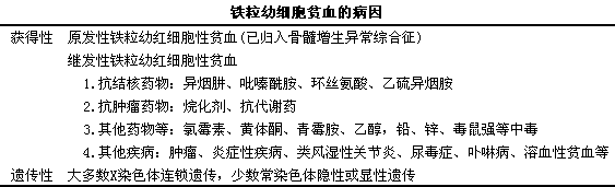 按病因分为:i遗传性和获得性,l后者又分为原发性和继发性,l详见下表。遗传性铁粒幼细胞贫血临床上罕见,l继发性铁粒幼细胞贫血也为偶发,l但总的来说。继发性要显著多于遗传性。铁粒幼细胞贫血的发病机制尚不清楚。由于血红素合成中的某些酶的缺陷.如δ氨基γ酮戊酸(ALA)合成酶缺陷,l使血红素合成障碍,l因为血红素的负反馈作用减弱,l尽管细胞内的铁已足够或很多,l铁的摄取仍明显增加,l过多的铁沉积在红细胞合成原卟啉的部位一线粒体上。因此铁普鲁士蓝染色后,l在幼红细胞内可见排列在核周围的铁颗粒,l这些环形铁粒幼红细胞是就是这组疾病的特异性的形态学标志。环形铁粒幼红细胞在铁的毒性效应下在髓内破坏而产生无效造血。过多的铁还可沉积在不同组织的实质细胞,l如心脏、i胰腺、i肝脏等,l可导致器官功能不全和遗传性血色病的类似结局。患者血清中的铁也增加,l如血清铁、i血清铁蛋白、i转铁蛋白饱和度均增加。