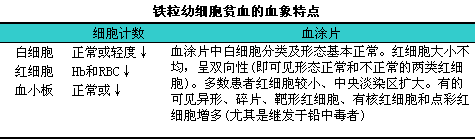 见下表。贫血呈低色素性,l红细胞大小不一,l分为大细胞性、i正细胞性和小细胞性三种,l临床上以小细胞低色素(即MCV、iMCH、iMCHC均下降)为主。网织红细胞计数正常或轻度增加。红细胞分布宽度(RDW)增高。原发性者可出现中性粒细胞颗粒过多或过少、iPelger-Huet核异常(即粒细胞分叶过少或不分叶)和少量幼粒细胞等。