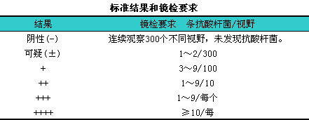 ③镜检与报告方式:i在暗色背景下,l抗酸杆菌呈黄绿色或橙色荧光。必须用40×物镜确认菌体形态,l应具有萋-纳氏抗酸染色镜经检验后,l方可应用荧光染色法,l注意勿过读或漏判。荧光染色后涂片应在24h内检查,l遇需隔夜时,l置4℃保存,l次日完成镜检。