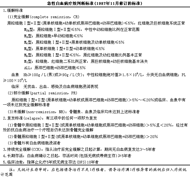 急性白血病的疗效标准目前国内采用l987年11月在江苏苏州召开的全国白血病化学治疗讨论会的标准,l详见下表。