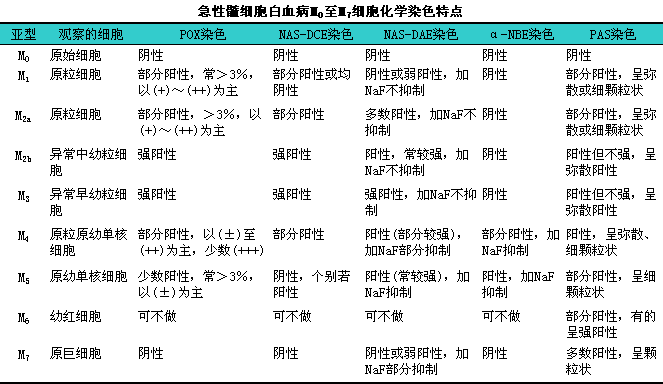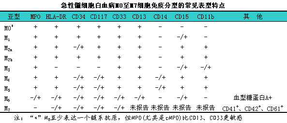 M0由于细胞化学染色均阴性,l细胞形态学也无明显特征.形态学检查不能确诊而只能提供提示性或怀疑性诊断意见.确诊必须要依靠免疫分型(不表达淋系而至少表达一个以上髓系抗原)或细胞超微MPO检查。