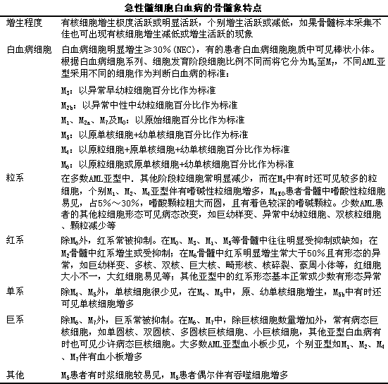急性髓细胞白血病具有白血病共同的一些特点:i贫血、i发热、i出血和器官浸润,l详见表11-2。其中出血最明显的为急性早幼粒细胞白血病且易导致弥散性血管内凝血,l其次为急性单核细胞白血病和急性粒单核细胞白血病,l其主要原因是血小板数明显减少所致;皮肤、i口腔和鼻咽部黏膜的浸润以急性单核细胞白血病和急性粒单核细胞白血病最为明显,l表现为牙龈或牙周的浸润和口腔脓肿、i喉阻塞及皮肤斑疹、i丘疹、i疱疹、i脓疱等;约1/3的患者肋下可触及的肝或脾大,l巨脾很罕见;淋巴结肿大及中枢神经系统的浸润在AML很少见(除单核细胞白血病);由于骨髓中白血病大量增生,l所以大多数患者常有胸骨下段压痛。有的AML(多数为M1、iM2,l少数为M4、iM5)可出现粒细胞肉瘤,l多见于儿童及青年人,l典型者好发于骨膜(尤其是眼眶),l可与AML同时或之后或之前出现,l之前出现称为原发性或孤立性粒细胞肉瘤。由于大多数的肉瘤中含有丰富的髓过氧化物酶,l在空气中切面呈绿色,l所以又称为绿色瘤(chloroma)。