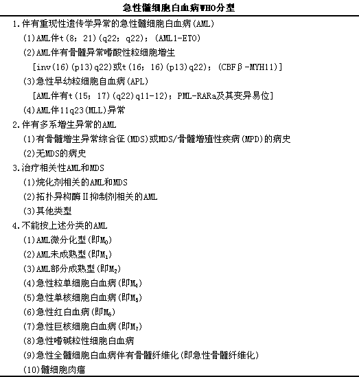 尽管FAB分类法已经沿用了30年,l但近几年来不断出现的免疫学、i细胞遗传学和分子生物学实验技术使人们对白血病的本质有了更深人的认识,l提出了MICM分型(morphology,limmunology,lcytogenetics,lmolecular1biology)。2000年世界卫生组织(WHO)综合了形态学、i免疫学、i遗传学、i分子生物学和临床特征等提出了造血系统肿瘤的WHO分型。WHO分型将造血系统肿瘤分为四大类:i髓系肿瘤、i淋系肿瘤、i组织细胞/树突细胞病及肥大细胞病。髓系肿瘤又分为急性髓细胞白血病(AML)、i骨髓增生异常综合征(MDS)、i骨髓增殖性疾病(MPD)和骨髓增生异常/骨髓增殖性疾病(MDS/MPD)。其中AML的WHO分型见下表,l在AML的WHO分型中,l骨髓中原始细胞的比例从30%降到20%,l如以前诊断为RAEB-t的患者现在诊断为伴多系异常增生的AML。而伴克隆性重复染色体异常的AML,l如t(8;21)(q22;q22)、iinv(16)(q13q22)或t(16;16)(p13;q22)、it(15;17)(q22;q11-12)等不论原始细胞多少均可诊断。