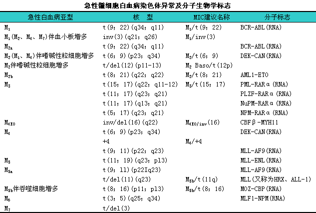 AML的分子生物学检查异常是与染色体改变密切相关的。如费城染色体阳性的患者BCR-ABL融舍基因呈阳性;M4常累及11号染色体,l11q23上有HRX(human1trithorax)基因,l又称为混合白血病(mixed1lineage1leakemia,lML)基因,l所以t(9;11)导致MLL-AF9融合基因形成,lt(11;19)导致MLL-ENL融合基因形成。