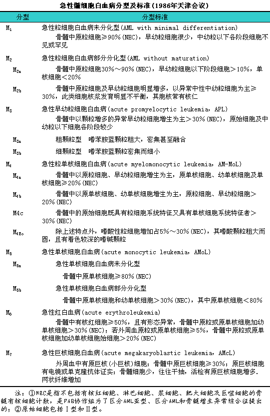 我国AML的分型采用1986年天津会议的白血病分型,l详见下表,l它在急性髓细胞白血病FAB分型基础上进行修定、i补充,l明确原始细胞分为Ⅰ型和Ⅱ型,l增加M7;并将我国首次提出的亚急性粒细胞白血病列为急性粒细胞白血病部分分化型的另一个亚型即M2b;另一个不同点是我国将M3分为M3a和M3b,l而FAB无M3a和M3b之分却增加了M3变异型(即M3v)。1991年FAB分型中又增加M0,l即急性髓细胞白血病微分化型(AML1with1minimal1differentia-tion),l其骨髓中原始细胞≥30%,l无T、iB淋巴系标记,l至少表达一种髓系抗原,l免疫组织化学染色或电镜髓过氧化物酶(MPO)阳性。