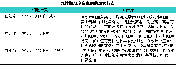 见下表。多数AML患者血常规检查的结果是:i白细胞数增加,l红细胞数和血小板数减少。多数患者自细胞数多在(30~50)×109/L,l少数高者可达100×109/L以上,l少数患者白细胞数正常、i下降或明显下降,l大约1/3患者低于5×109/L。贫血的程度不等,l轻者为轻度贫血,l重者为可低于50g/L,l而无贫血的患者少见;贫血一般呈正细胞正色素性,l少数患者如M6或白血病治疗后可为大细胞性。血小板数常下降,l严重者小于10×109/L,l个别患者血小板数增加(见于个别M1、iM2、iM4、iM7患者)。AML中的M3、iM2b、iM6、iM7亚型(尤其是M3)常表现为全血细胞减少。