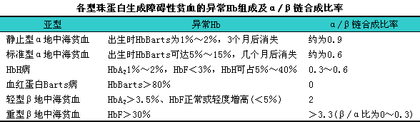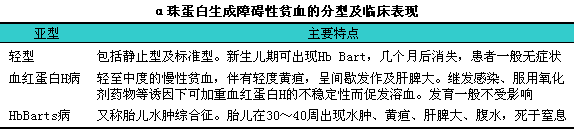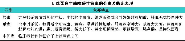 珠蛋白生成障碍性贫血属于慢性血管外溶血。患者自幼患病,l多有家族史。临床表现的严重程度与疾病的类型密切相关。α珠蛋白生成障碍性贫血和β珠蛋白生成障碍性贫血的分型及临床表现分别见下表。