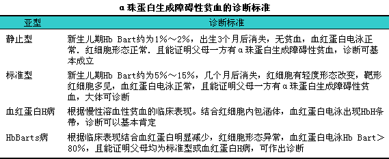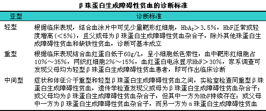 α珠蛋白生成障碍性贫血和口珠蛋白生成障碍性贫血的诊断标准分别见下表。为进一步确定诊断,l可行α和β珠蛋白链的合成比率测定和基因分析。