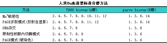 1.解脲支原体解脲支原体(Uu)叉称解脲脲原体,l是支原体目脲原体属一成员,l于1954年Shepard首先从NGU患者的尿道分泌物分离获得,l因菌落细小故名T株(Tinystrain)。目前认定,lUu为性传播疾病的主要病原体之一,l主要通过性接触传播和母婴传播。常从男、i女性的下生殖道,l以及早产、i低体重儿(<21500g)、i胎膜早破、i死胎等不良妊娠胎儿的羊水、i脐带血中得以分离。含14个血清型,l国内外大量文献证实,l虽然Uu在男女泌尿生殖道有很高的携带率(60%~70%),l其中以3型居多。另一些血清型不仅引起NGU,l并且还是多种泌尿生殖道感染性疾病,l如前列腺炎、i附睾炎、i女性阴道炎、i盆腔炎、i宫颈炎、i男、i女性不育和不孕等泌尿生殖道感染的常见病原体之一。尤其是近年研究提示,l女性生殖道uu的定居与诸如早产、i自发性流产以及胎儿官内感染,l并最终导致新生儿早产、i低体重、i胎膜早破、i死胎等不良妊娠结果;同时Uu还是新生儿败血症、i支气管肺炎、i脑膜炎等中枢神经系统致死性感染的重要原因。Uu的脂多糖抗原主要存于细胞膜中层的脂质部分,l该糖为中性糖,l由甘露醇、i葡萄糖、i半乳糖组成,l其中三个糖残基所组成的重复片断具有每个血清型别的抗原特异性。该糖可作为诱生原,l刺激机体产生相应型的IgM抗体,l并引起家兔发热反应。采用免疫电泳和免疫印迹法,l对Uu蛋白进行分析,l各菌株间均呈现极为相似的多条带,l因而称多带抗原(MB-Ag),lMB-Ag是Uu的主要膜抗原,l具有种特异性,l也包含血清特异抗原决定簇,l还含有血清型交叉反应抗原决定簇。近年来研究提示,l利用表型和基因型特征的不同将Uu的14个血清型菌株依据表型和基因型特征的不同分两大生物群,l“T9601biovar”即A群各型均含有16kD和17kD多肽,l包括2、i4、i5、i7、i8、i9、i10、i11、i12型等9个血清型。而“parvo1biovar”即B群,l含17kD多肽,l包括1、i3、i6、i14等4个血清型(见下表)。