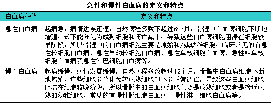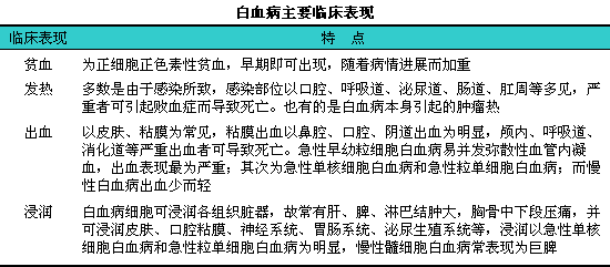 急性白血病主要临床表现为:i贫血、i发热、i出血及浸润,l而慢性白血病常无症状,l在体检时发现,l或出现低热、i体重减轻、i疲乏等非特异性症状为主。详见下表。