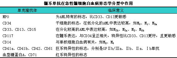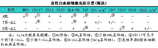 急性髓细胞白血病和急性淋巴细胞白血病各种亚型的细胞免疫分型特点分别见本章第二节、i第三节。目前对急性淋巴细胞白血病分型的研究比较深入.可分出各种亚型,l而急性髓细胞白血病中的髓系特异性和相关性抗原的表达常不能严格代表细胞的成熟程度,l目前还没有发现粒细胞和单核细胞各自分化发育阶段特异性CD抗原,l这在一定程度上制约了急性髓细胞自血病细胞免疫分型的深入研究。虽然其细胞免疫分型不如急性淋巴细胞白血病明确,l但随着细胞免疫分型的研究及普及,l已初步建立了细胞免疫分型与急性髓细胞白血病形态分型之间的关系,l达成了一些共识,l详见下表。