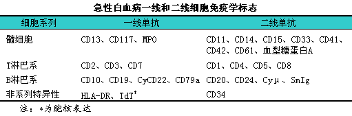 由于慢性白血病骨髓中白血病细胞的系列和阶段判断较容易,l所以细胞免疫分型对其疾病的诊断意义不大,l而细胞免疫分型是急性白血病常规要做的检查项目。我们把用于急性白血病分型的常用单克隆抗体分为一线和二线,l详见下表;一线用于筛选急性白血病细胞系列(如髓细胞、iT淋巴细胞、iB淋巴细胞),l详见下表,l二线单抗用于判断系内亚型。