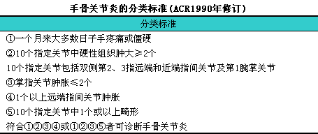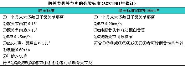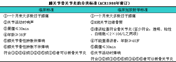 1.原发性骨关节炎诊断 尽管根据临床,lX线和实验室检查可以很直观的对骨关节炎进行诊断。但也有不典型表现。美国风湿病学会(ACR)1986年、i1990年、i1991年的膝、i手和髋关节骨性关节炎的分类标准,l见下表。