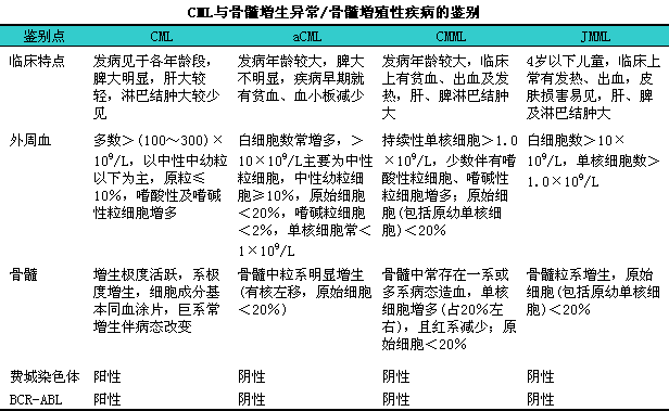 3.与骨髓增生异常/骨髓增殖性疾病(MDS/MPD)的鉴别MDS/MPD主要包括不典CML(aCML)、i慢性粒单核细胞白血病(CMML)、i幼年型粒单细胞白血病(JMML),lCML与这三者的鉴别见下表。并且还要与其他骨髓增殖性疾病进行鉴别。