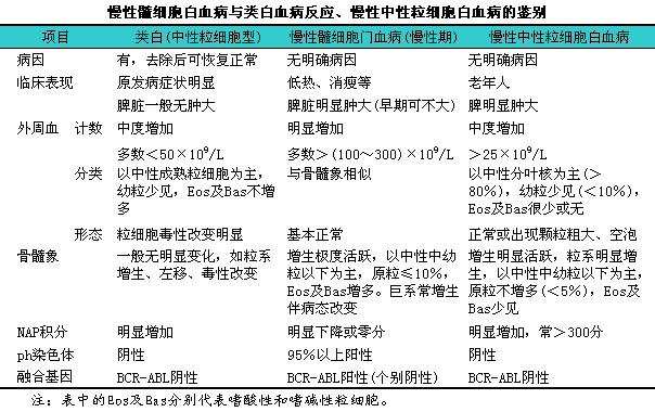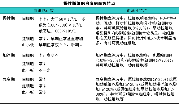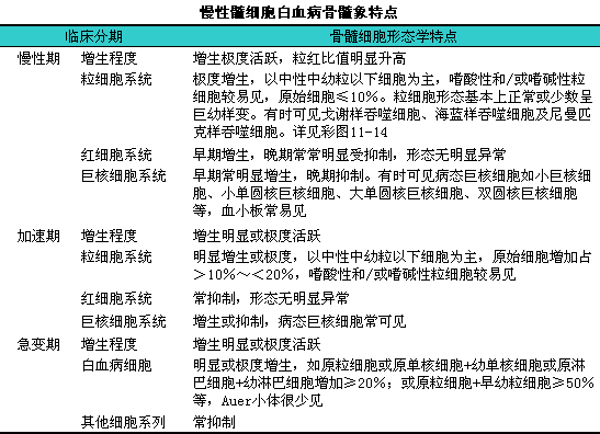 见下表。通过骨髓常规检查,l结合血涂片NAP染色及血涂片细胞分类,l通常可以确诊并明确分期。对于复查的患者,l通过骨髓涂片的检查判断患者疗效及疾病进展情况。