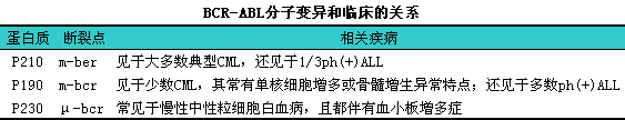 由于t(9;22),l使9q34上原有的c-ABL原癌基因易位到22q11上和BCR基因融合,l形成BCRABL融合基因。根据BCR基因断裂点不同可分为3种不同BCR-ABl,l融合基因,l经过转录、i翻译,l分别产生分子量为210kD、i190kD、i230kD的蛋白质(即P210、iP190、iP230),l这些蛋白质和不同的疾病相关.详见下表。表达异常的ABL相关蛋白P210存在于细胞质中,l具有失控的酪氪酸激酶活性。失控的酪氨酸激酶导致髓细胞异常增生,l是CML的主要发病机理。