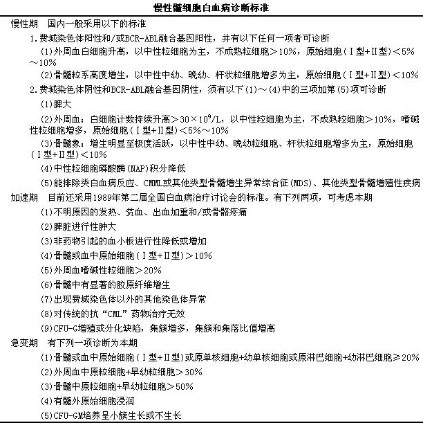 慢性髓细胞白血病诊断并不困难,l各期的诊断标准和缓解标准分别见下表。