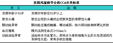 1.渗断标准11目前采用11990年ACR巨细胞动脉炎分类标准作为诊断标准。见下表。