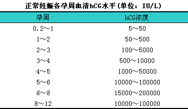 (3)参考范围:i尿液阴性;血清非孕妇女(血hCG)<10IU/L,l妊娠期间血清hCG水平见下表。