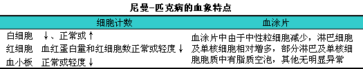 详见下表。如果患者伴脾功能亢进,l常全血细胞数减少。淋巴细胞、i单核细胞的胞质中出现特征性空泡是诊断该病的重要实验室依据之一,l往往是由于鞘磷脂堆积产生的。