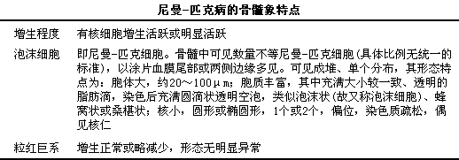 由于骨髓检查常能发现一定数量形态学上具有特异性的尼曼-匹克细胞,l所以典型患者通过骨髓检查并结合临床通常能做出确诊性的诊断意见。其骨髓象特征见下表,l尼曼-匹克细胞特点见彩图16-3。有些患者还可见海蓝组织细胞增多.可能是鞘磷脂向腊样质转变引起的。
