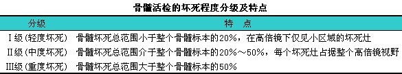 确诊本症最重要的依据之一,l骨髓活检还可以判断骨髓坏死范围,l典型者呈现大量胶状物质并包绕着变形、i坏死的细胞。骨髓坏死累及的范围大小不一,l有的仅累及少数细胞,l大者可占整个活检标本。坏死表现为嗜伊红染色,l呈颗粒状,l重者表现为嗜伊红均质片状,l有的细胞轮廓还隐约可见,l严重者支架亦受影响。有些病例在坏死周围可有细胞反应,l有的边缘区可见到渐进性坏死表现。根据坏死的程度及范围可以分为三级,l详见下表。