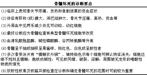 由于骨髓坏死出现在多个部位,l且与正常骨髓相互交错,l故有时需多部位穿刺才能明确诊断。对于骨髓坏死病例应动态观察病情,l当出现血象异常时,l应及时进行骨髓检查,l以除外是否发生白血病。该机理可能与骨髓坏死后髓内发生强烈反应导致克隆突变有关。有文献报道骨髓坏死修复后发生白血病的病例。