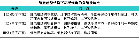 镜下完整的有核细胞极度减少,l仅见少数成熟的红细胞及无结构细胞。根据细胞破坏的程度将它分为两种:i①完全溶解破坏的细胞:i细胞结构不清晰,l胞膜破坏,l胞核固缩;②部分溶解破坏的细胞:i胞膜结构不完整,l细胞器部分消失,l少数分布的线粒体中嵴排列紊乱,l甚至泡化,l颗粒较多,l可见少数粗面内质网及核糖体,l核不规则,l以染色质为主,l在核周边有板块形成,l核孔增多。坏死细胞也有三级分类法,l洋见下表。光镜下大量溶解状态的细胞是本病诊断的主要依据,l而超微结构及细胞化学染色过氧化物酶阴性、i脱氧核糖核酸阴性或阳性有助于鉴定坏死细胞的等级和活性。