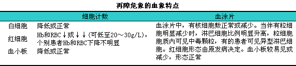 少数患者骨髓增生减低或极度减低,l粒系、i红系、i巨系细胞均明显减少.淋巴细胞比例明显增加,l非造血细胞增多,l要注意与重型再障鉴别。再障危象短时间内常可恢复正常.因此必要时应复查,l以明确诊断。个别患者骨髓中红系明显减少,l但临床上尚未出现贫血,l所以要注意动态观察。