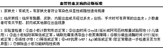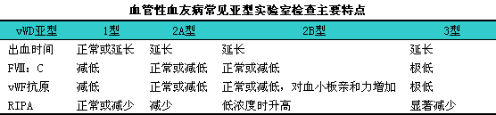 其诊断标准见表诊断下表。实验室分型检查包括①瑞斯托霉素(Ristocetin)诱导的血小板聚集反应(RIPA);②vWF交叉免疫电泳;③血浆中及血小板中vWF:iAg多聚体的分析,l其各亚型的实验室检查主要特点见下表。由于本病的出血特点类似于血小板功能异常或FⅧ减少的疾病,l所以要注意与血友病A、i血小板减少症、i血小板型假血管性血友病等进行鉴别。