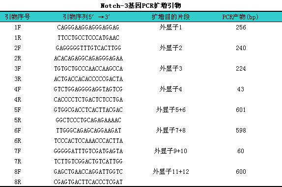 3)该病PCR方法检测成功的关键在于引物的设计,l建议用primer软件设计引物。CADASIL诊断用的常用引物见下表。