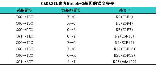 1)有学者利用正、i反向测序证实先证者存在Notch-3基因的杂合性突变,l且突变位点各不相同,l有的突变位于外显子3,l分别为268C→T、i322C→T和328C→T突变(核苷酸的位置从翻译起始密码子ATG的A算起),l造成Notch-3蛋白质突变分别为R90C、iC108R和R110C;有的先证者突变位于外显子11为1819C→T.造成R607C。其他常见基因的错义突变见下表。